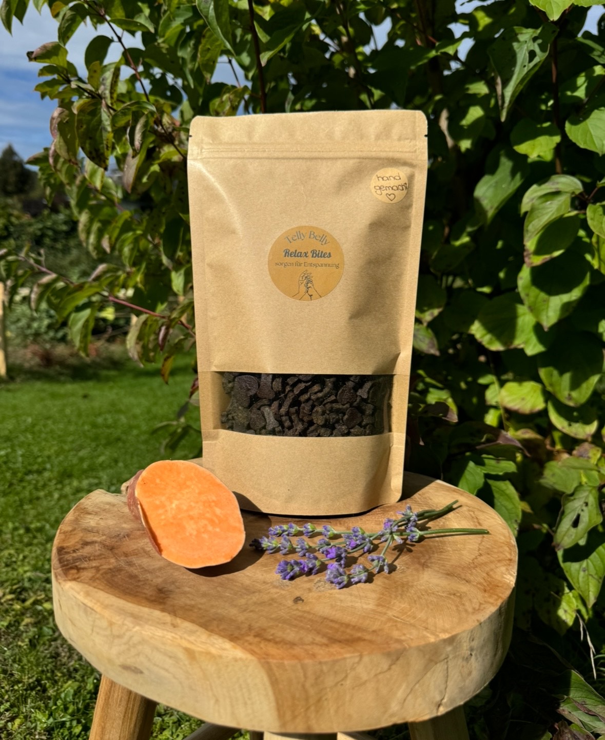 Unsere rein pflanzlichen "Relax Bites" sind getreidefreie, vegane, handgemachte Hundeleckerlis, die mit beruhigenden Kräutern und hochwertigen Zutaten liebevoll von Hand gefertigt werden. Sie eignen sich ideal als begleitender Snack für Hunde in stressigen oder ungewohnten Situationen – etwa bei Gewitter, Reisen oder an Silvester.